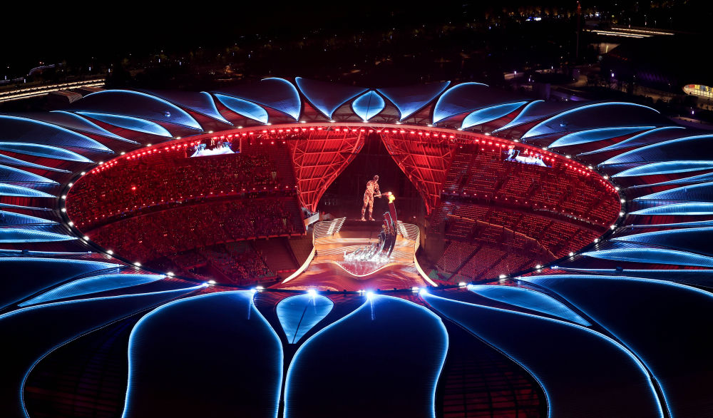 On September 23rd, 2023, the last torchbearer Wang Shun and the digital torchbearer lit the main torch at the opening ceremony of the Asian Games in Hangzhou. Xinhua News Agency reporter Cheng Tingting photo