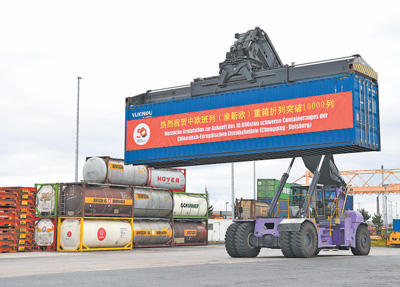 On July 11th, the first China-Europe train line, the 10000th heavy box of China-Europe train (Chongqing New Europe), was folded and arrived in Duisburg, Germany. The picture shows the staff loading and unloading containers. Xinhua News Agency reporter Ren Pengfei photo
